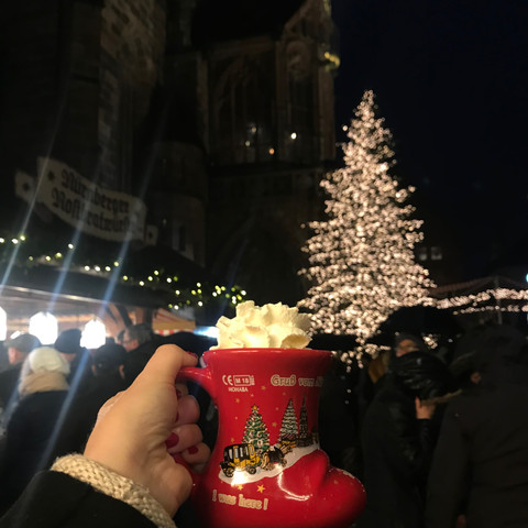 The next day was Christmas Eve and we found one market close by that was still open. The Christmas markets in Germany run from about the 1st to the 23rd of the month. We came to the small town of Forchheim and the cutest little market ever! We even saw the traditional Advent calendar on the windows of a church in the main square. I traded my traditional gluühwein for some Schneeman punsch aka snowman punch and traded sips with Mom for some of her amaretto hot cocoa. The highlight was definitely finding the lágos again and getting to watch everyone try a bite of the fried, garlicky, cheesy dough.
