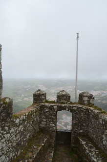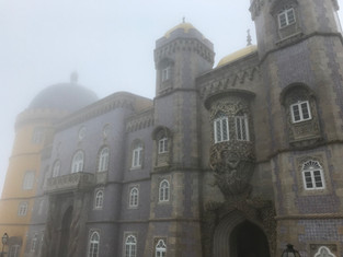 Our next stop was a hike through a muddy trail where we ended at Pena Palace. Normally, the palace is very vibrant and colorful with the facade painted in yellow and red with blue tiles. Unfortunately, since we currently were in a cloud, we could barely see across the courtyard to the muted colors. We braved the rain (now coming down sideways) and took a lap around the castle. I could imagine how pretty it was on a nice day. We decided against waiting in the long line to get into the castle itself and opted to grab the train back to Lisbon for some food and a change of clothes.