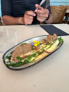 Dinner was amazing! We split a bottle of wine (après l’effort, le réconfort !) and started off with a tataki de thon while the sun set in front of us. If that’s not a great end to a day, I don’t know what is! And, in a twist of fate, we shared two fish dishes - spicy-crusted cod and a swordfish with risotto. When in 𝖱̶𝗈̶𝗆̶𝖾̶ Collioure, right?